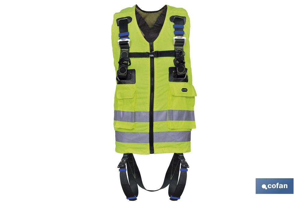 Arnés anticaídas con chaleco de trabajo de alta visibilidad amarillo, dos puntos de enganche en el pecho, un punto de enganche esternal formado por dos hebillas textiles, una argolla en D dorsal para sistema anticaida y dos bucles automáticos.