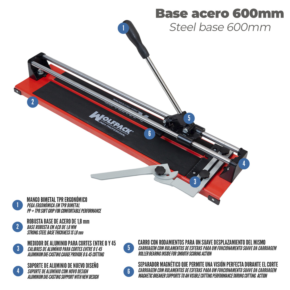 Corta Azulejos Profesional Base Acero 600 mm. - Rodel con rodamientos internos 22x6x6 mm. - Mango Bimetal TPR ergonómico. - Robusta base de acero de 1,8 mm. - Medidor de aluminio para cortes entre 0º y 45º. - Soporte de aluminio de nuevo diseño. - Carro con rodamientos para un suave desplazamiento del mismo. - Separador magnético que permite una visión perfecta durante el corte. - Artículo también conocido como cortador azulejos, cortazulejos, cortaazulejos, corta azulejos, cortador de baldosas, cortador cerámica, cortador manual, etc.